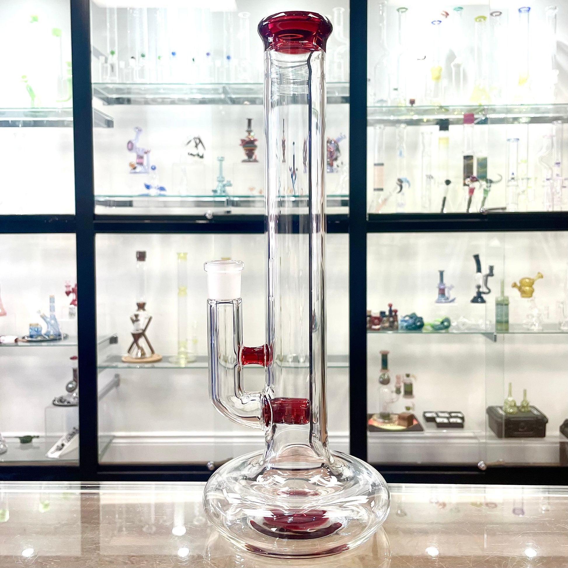 Clear Hollow Foot Tube by Green Belt Glass, combines clean aesthetics with enhanced water capacity. Standing 14 inches tall, this tube features a slim hollow foot, allowing additional water to be utilized during function for smoother pulls and improved filtration.